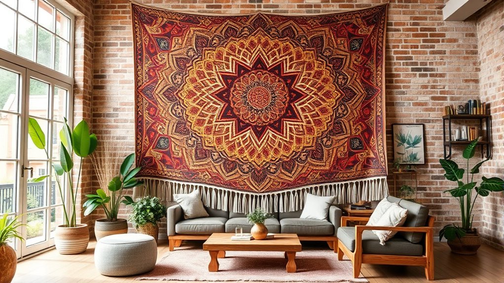 I love finding eco-friendly options for oversized boho tapestries. Organic cotton, recycled polyester, and bamboo fibers are fantastic choices that are gentle on the planet. I recommend looking for tapestries crafted with sustainable materials and eco-conscious dyes. Not only do they add artistic allure to your space, but they also support sustainable practices. Going green with your decor can truly make your home harmonious and help the environment too!